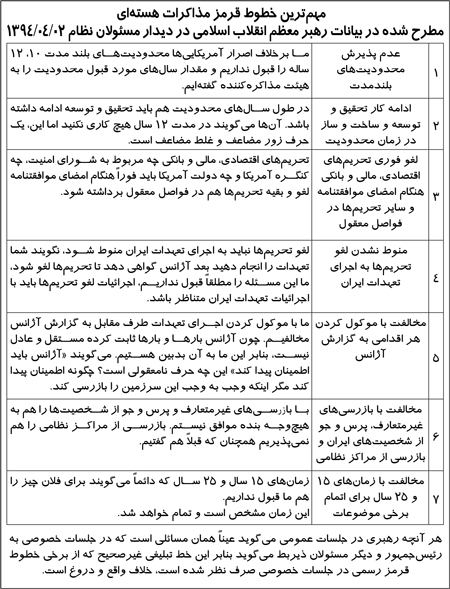 گفتنی است خطوط قرمز مد نظر رهبر انقلاب عینا به نقل از پایگاه اطلاعرسانی معظمله و داخل گیومه ذکر میشود.