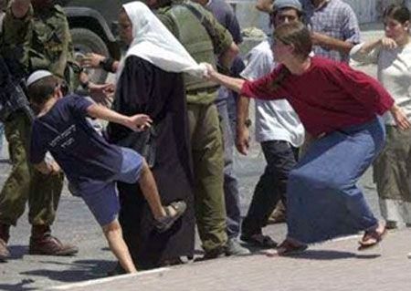 نمایی از رفتار شهرکنشینان بیفرهنگ صهیونیست با همسایگان فلسطینی، در حضور نیروهای نظامی اسرائیل!