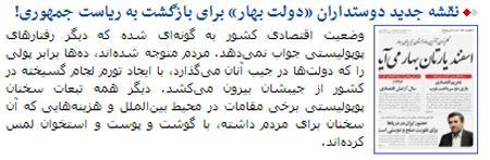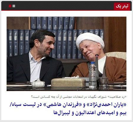 در سوی دیگر، اصولگرایان به صورت رسمی برای حذف رقیب توجیه شرعی و ایدئولوژیک می تراشند و این اقدام را حتی به آسمان و خون شهدا گره می زنند. این رفتار تنها در طیف های رادیکال این جریان مشهود نیست. رفتار رسانه های نزدیک به دو چهره اصولگرا که کوشیده اند به عنوان عناصر میانه رو از خود تصویر سازی کنند، در همین روزهای اخیر جالب توجه است. سایت تابناک، وابسته به محسن رضایی اخیرا در گزارشی تحت عنوان «نقشه جدید دوستداران «دولت بهار» برای بازگشت به ریاست جمهوری!» از تلاش جریان احمدی نژاد برای ادامه بقا و حیات سخن به میان آورده است. این پایگاه خبری تحلیلی شاخص پس از اعتراف تلویحی به قدرت اجتماعی رو به فزونی حامیان احمدی نژاد، از لزوم برخورد با این جریان سخن به میان می آورد و می نویسد: «انقلابیون کشور، کسانی از چپ و راست و دیگران که دل در گرو امام، انقلاب و رهبری دارند، باید خود را آماده نبردهای جانانهتری کنند.» نبرد جانانه همان اتحاد برای حذف مجدد حامیان احمدی نژاد است؛ جریانی که در آخرین باری که اجازه حضور در انتخابات را پیدا کرد، با رای آری 24 میلیون ایرانی مواجه شد. جالب آنکه معروف ترین پایگاه خبری ایران نمی تواند خشم خود را از فعالیت رسانه ای مثل دولت بهار که با بضاعتی بسیار محدود در حال فعالیت برای حامیان احمدی نژاد است، پنهان کند، بلکه این خشم را در عنوان گزارش خود بروز می دهد.