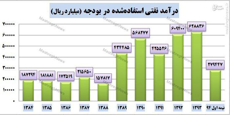 به عنوان مثال، در سال 1393 دولت یازدهم نزدیک به 63 هزار میلیارد تومان از محل درآمدهای نفتی در بودجه خرج کرد. این در حالی است که دولت قبل در هیچ سالی تا این حد از درآمدهای نفتی در بودجه استفاده نکرده بود.