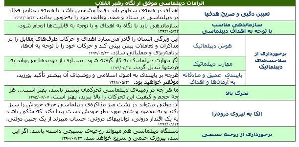 علاوه بر موارد مندرج در جدول مذکور، فرماندهی معظم کل قوا، در دیدار با کارکنان وزارت امور خارجه در تابستان سال 1393، پنج ویژگی دیپلماسی ایرانی را تبیین فرمودند. اولین ویژگی این دیپلماسی از دیدگاه رهبر معظم انقلاب اسلامی، پایبندی به موازین شرع است که در عرصهی رفتارهای فردی و در محافل دیپلماتیک، باید رعایت شود. نترسیدن از هیبت و تشر قدرتهای بزرگ از جمله آمریکا، دومین ویژگی دیپلماسی ایرانی از نگاه معظمله است که نتایج آن ایجاد جاذبه در دل ملتها و تعظیم و تجلیل سیاستمداران دنیا نسبت به جمهوری اسلامی ایران بیان شده است. ایشان ویژگی سوم دیپلماسی ایرانی را دفاع صریح، قاطع و واقعی از مظلوم دانسته و جلوگاه آن را دفاع از ملت و مبارزین فلسطینی، لبنانی و موارد مشابه دیگر توصیف کردهاند.