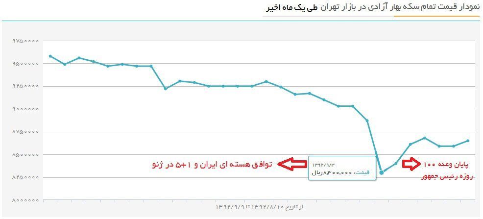 با توجه به افت ناگهاني قيمت طلا ،سكه و ارز بعد از توافقات در ژنو؛ حال نظاره گر آن هستيم كه بعد از ارائه گزارش 100 روزه دولت آقاي روحاني قيمت ها به حالت قبل باز مي گردد!و اين نكته مبهم را در ذهن مردم ايجاد مي كند كه پایین آمدن لحظه ای قیمت ها فقط براي ارائه گزارش 100 روزه دولت بوده است!؟