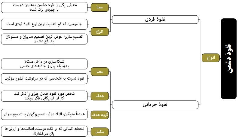 در این نمودار «راهکار نفوذ دشمن»، «عرصههای نفوذ دشمن»، «راه مقابله با نفوذ دشمن» و «انواع نفوذ دشمن» مرور شدهاند.