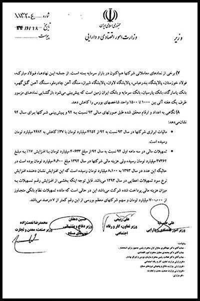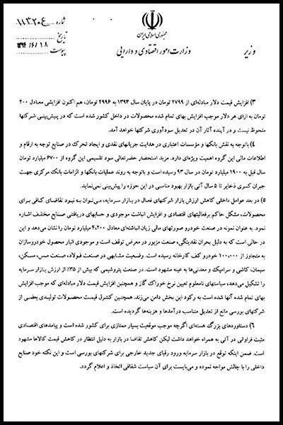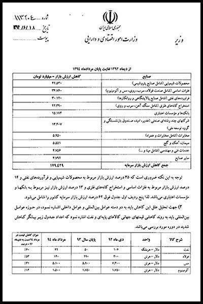 در نامه مشترک علی طیب نیا، محمدرضا نعمت زاده، علی ربیعی و حسین دهقان وزرای اقتصاد، صنعت، کار و دفاع به حسن روحانی رئیس جمهور آمده است: «همانطور که مستحضرید از دی ماه ۱۳۹۲ تاکنون بازار سرمایه متاثر از تحولات و متغیرهای کلان بین المللی و داخلی از جمله کاهش بهای نفت و کالای اساسی از جمله فلزات و همچنین تحریمها و برخی تصمیمات و سیاستهای ناهماهنگ دستگاهها در داخل کشور شاهد افتی کم سابقه گردیده است به نحوی که از دی ماه سال ۱۳۹۲ تاکنون ظرف مدت ۱۹ ماه ارزش بازار بر اساس شاخص قیمت ۴۲ درصد کاهش یافته و به لحاظ افت ارزش، بازار کاهشی معادل ۱۸۰ هزار میلیارد تومان را شاهد است. (ارزش بازار از ۵۱۱ هزار میلیارد تومان در دی ماه ۱۳۹۲ امروز به عدد ۳۳۰ هزار میلیارد تومان رسیده است) و امروز در پی دستاورد بسیار ارزشمند و بزرگ هسته ای ملت ایران و در عین وجود پی آمدهای مثبت اقتصادی فراوان آن ابهاماتی نیز در بازار ایجاد شده که باید سریعا واکنش نشان داد.»