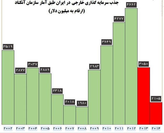 به گزارش «پايگاه خبري تحليلي رئيس جمهور ما»؛ بر اساس اعلام کنفرانس تجارت و توسعه سازمان ملل (آنکتاد) در نخستین سال اجرای توافق ژنو، سرمایهگذاری مستقیم خارجی به میزان ۲ میلیارد و ۱۰۵ میلیون دلار بوده که بیانگر کاهش ۳۱ درصدی است. همچنین در این زمینه رتبه ایران در رده بندی جهانی ۱۴ پله سقوط کرد.