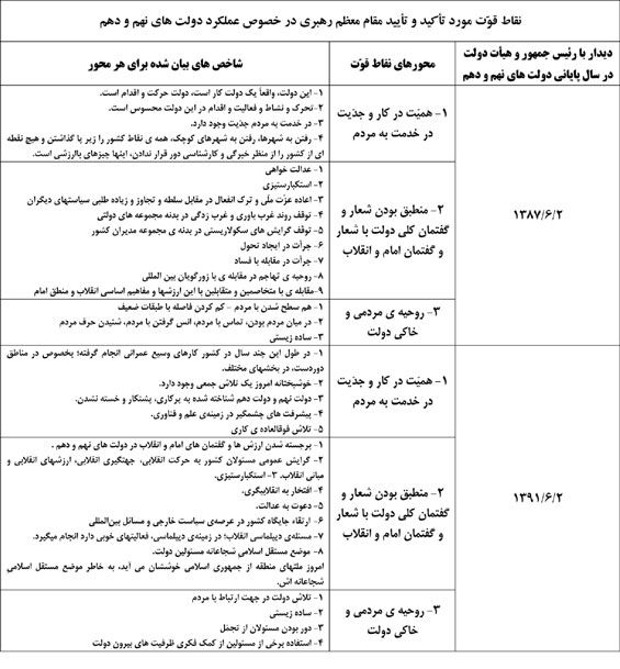 ذیلاً جمع بندی بخش اول این گفتار همراه با جدول خلاصه شده نقاط قوت دولت های نهم و دهم از دیدگاه مقام معظم رهبری و به دنبال آن