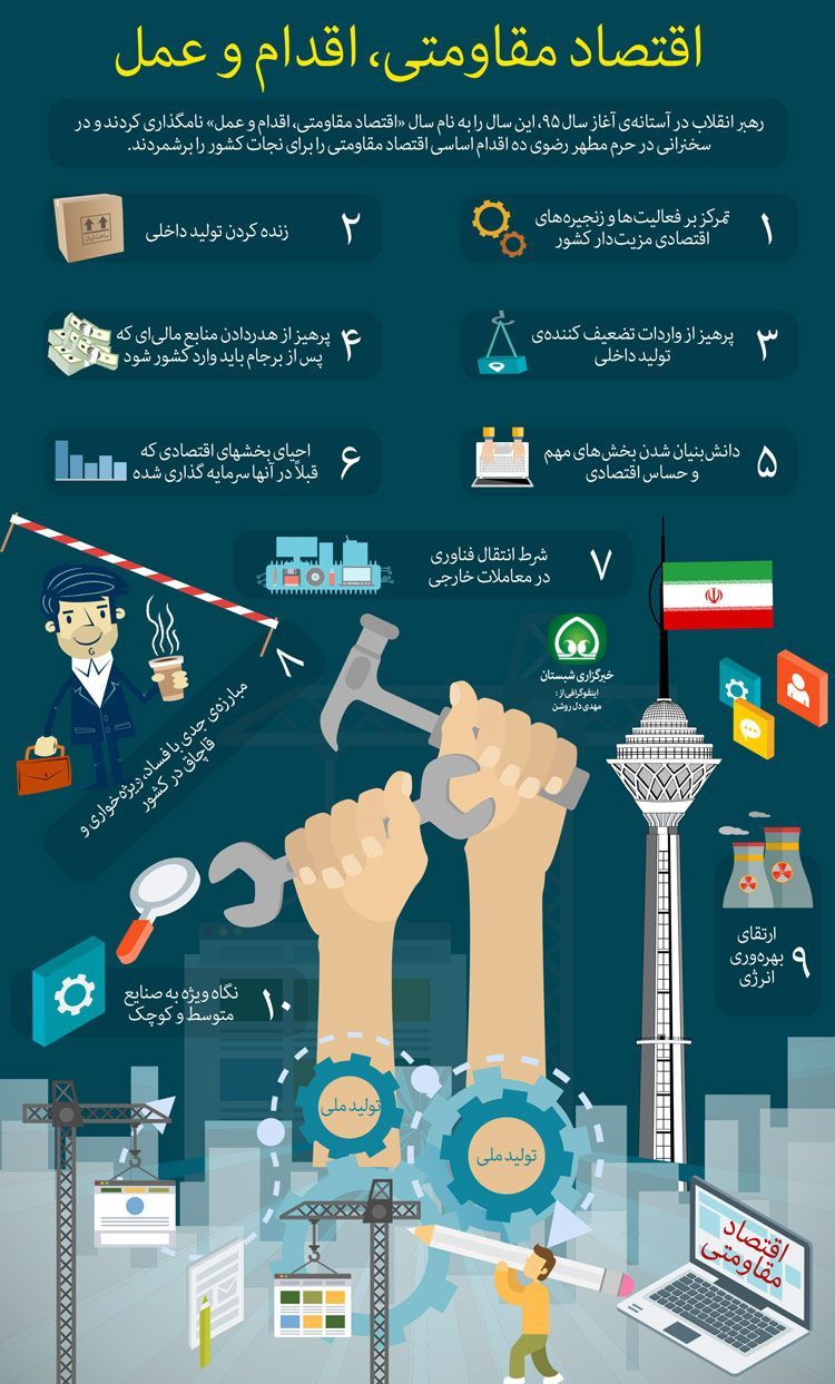به گزارش «پايگاه خبري تحليلي رئيس جمهور ما»؛ رهبر معظم انقلاب در آستانهی آغاز سال ۹۵، این سال را به نام سال «اقتصاد مقاومتی، اقدام و عمل» نامگذاری کردند و در سخنرانی در حرم مطهر رضوی ده اقدام اساسی اقتصاد مقاومتی را برای نجات کشور را برشمردند: