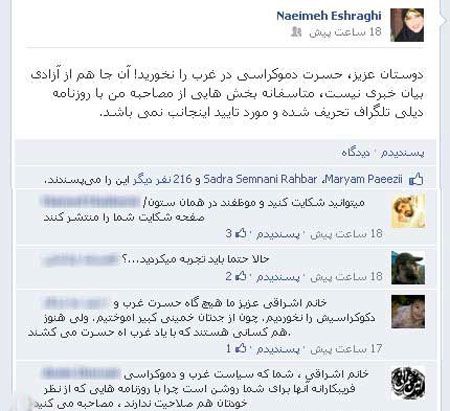 «دوستان عزیز، حسرت دموکراسی در غرب را نخورید! آن جا هم از آزادی بیان خبری نیست، متأسفانه بخش‌هایی از مصاحبه من با روزنامه دیلی تلگراف تحریف شده و مورد تایید اینجانب نمی‌باشد.»