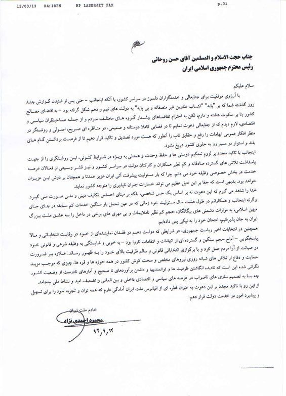 با آرزوی موفقیت برای جنابعالی و خدمتگزاران دلسوز در سراسر کشور، با آنکه اینجانب حتی پس از شنیدن گزارش چند روز گذشته شما که بر "پایه" انتساب عناوین غیرمنصفانه و بیپایه به دولتهای نهم و دهم شکل گرفته بود-به اقتضای مصالح کشور بنا بر سکوت داشته و دارم، لکن به احترام تقاضاهای بیشمار گروههای مختلف مردم و از جمله صاحبنظران سیاسی و اقتصادی، لازم دیدم که از جنابعالی دعوت نمایم تا در فضایی کاملا دوستانه و صمیمانه، در مناظرهای صریح، اصولی و روشنگر در منظر افکار عمومی ابهامات را رفع و حقایق ناب را آنطور که هست مورد تصدیق و تأکید قرار دهیم تا از فرصت برداشتن گامهای بلند و استوار در مسیر رو به جلوی کشور دریغ نشود.
