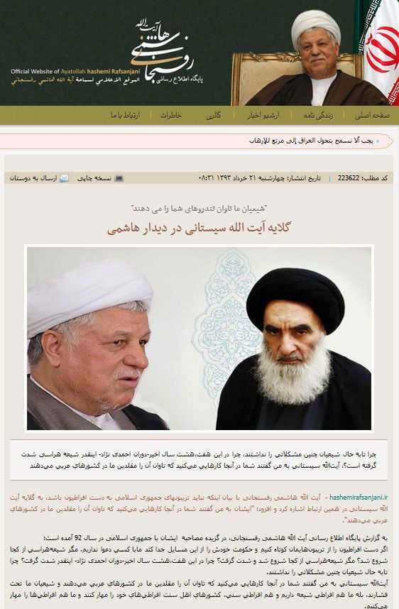 سایت هاشمی طوری دقیق این مطالب را پشت سر هم آورده است که هر مخاطبی آن را بخواند، آیت الله سیستانی را در مقابل مواضع احمدی نژاد می داند. این موج جدیدی که جریان هاشمی سوارش شده، بر پایه سو استفاده از نام علما و مراجع تقلید است و عاقبت خوشی ندارد.