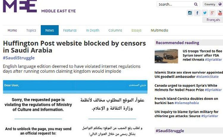 تصاویر به اشتراک گذاشته شده بر روی توئیتر نشان می داد که کاربران اینترنت در تلاش برای بازدید از صفحه اصلی روزنامه انگلیسی زبان «هافینگتون پست» چاپ آمریکا، با پیامی از سوی وزارت فرهنگ و اطلاعات عربستان روبرو می شدند که مدعی بود این صفحه قوانین این وزارتخانه را زیرپا گذاشته است.