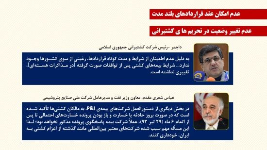 وي افزود: در بحث بيمهي کشتيراني، اظهارات مسئولين صراحت دارد که به دليل آنکه تحريمها تعليق شده بودند و آن هم به مدت کوتاه، شرکتهاي بيمهي بينالمللي حاضر نشدند ما را بيمه کنند و همچنان اين بيمه با مشکل مواجه بود و البته من اين را هم بگويم که ما دست بسته نيستيم در مقابل تحريمها. اين را تأکيد کنم که در مورد همين شرکتهاي بيمه ما رفته بوديم شرکتهاي بيمه داخلي ايجاد کرده بوديم و الان هم داريم با همان شيوههاي قبل از توافق مشکلمان را تا حدي حل ميکنيم.