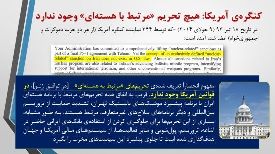 کارشناس تحريم با تأييد اظهارات مجري برنامه گفت: اصلاً اين واژهي Nuclear-related Sanctions يک واژهاي است که شايد قبل از اين اصلاً سابقه نداشته است و با توافقات اخير وارد فضاي حقوقي، سياسي و اقتصادي شد. اين را اتفاقاً ۳۴۴ نفر از نمايندههاي کنگره نامه زدند به اوباما و در نامه اشاره کردند که مفهوم تحريمهاي مرتبط با هستهاي اصلاً در قوانين آمريکا وجود ندارد. بعضاً فکر ميکنند که تفاوتي وجود دارد بين کنگره و دولت آمريکا. کنگره آن نامه را زده است و دولت آمريکا هم در پارافهاي نهايي که همين چند ماه پيش منتشر کرده است، اين را گفته است که معماري تحريمهاي مرتبط با هستهاي کاملاً حفظ ميشود و بازگشتپذير هم هست. بحث تروريسم، حقوق بشر و موشکهاي بالستيک را هم گفته است.