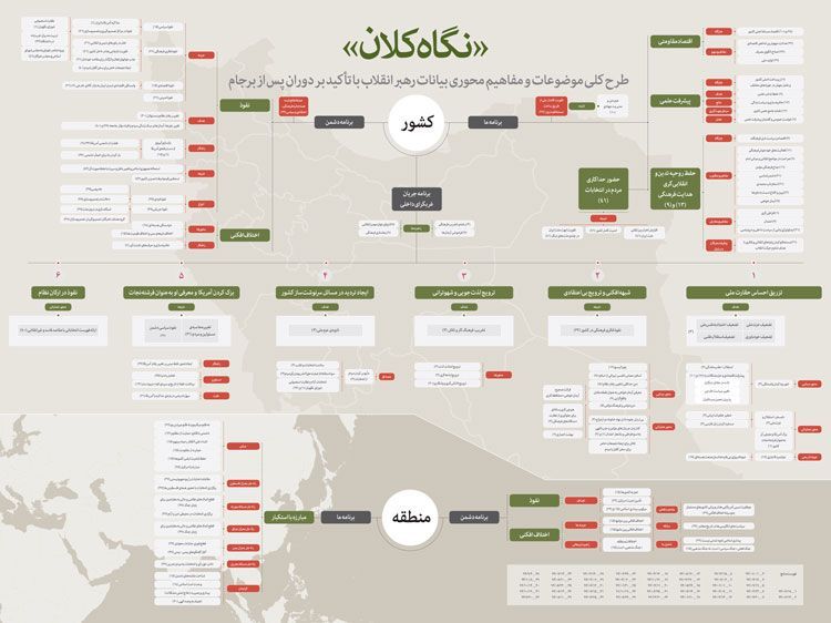 به همین مناسبت «پايگاه خبري تحليلي رئيس جمهور ما» نمودار «طرح کلی موضوعات و مفاهیم محوری بیانات رهبر معظم انقلاب« را با تأکید بر مباحث مطرحشده در دورهی پسابرجام در تبیین برنامهها و اقدامات این سه جریان منتشر میکند.(+)