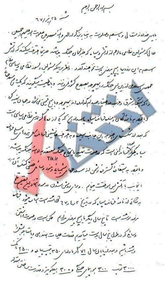 "آقای نخست وزیر از قول وزرای اقتصاد و بودجه وضع مالی نظام را زیر صفر اعلام كردهاند، مسئولان جنگ میگویند تنها سلاحهایی را كه در شكستهای اخیر از دست دادهایم به اندازه تمام بودجهای است كه برای سپاه و ارتش در سال جاری در نظر گرفته شده بود. مسئولان سیاسی میگویند از آنجا كه مردم فهمیدهاند پیروزی سریعی به دست نمیآید شوق رفتن به جبهه در آنها كم شده است. شما عزیزان از هر كس بهتر میدانید كه این تصمیم برای من چون زهر كشنده است ولی راضی به رضای خداوند متعال هستم"